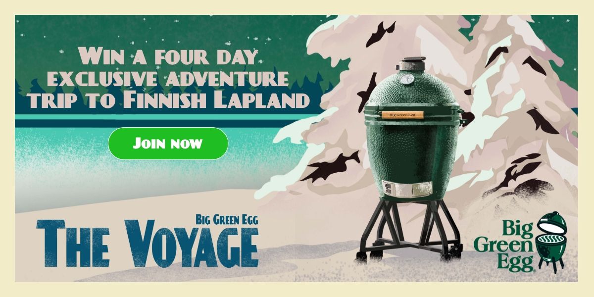 Gewinnen Sie eine Reise nach Finnisch-Lappland! Nordlichter beobachten, geniessen Sie ein Abendessen zubereitet von einem Michelin Star Chefkoch, eine Husky-Schlittenfahrt, Eisfischen und bereiten Sie Ihren Fang auf dem Big Green Egg vor. Das alles exklusiv für Sie und 100 weitere glückliche EGG-Fans.
